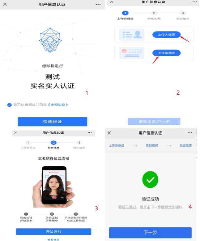 第一步:考生点击快速验证,上传身份证正反面,身份证上传成功后进行实名实人认证操作(需上传至少3秒本人视频确认本人在操作此流程)。考生完成实人认证后,点击进入下一步。