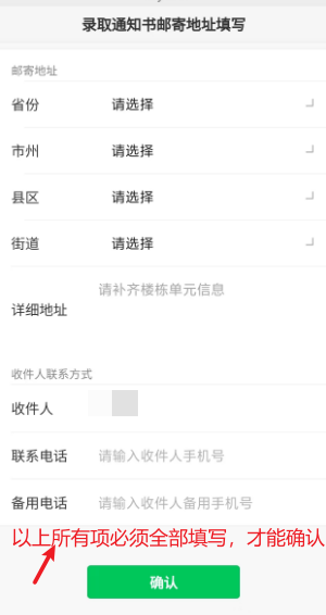 请认真填写详细收件地址,按要求选择和填写所有项(所有项必须填写,才能确认),确认后则完成确认入读操作。