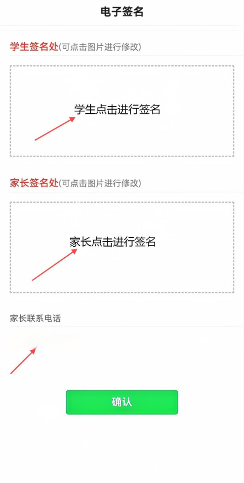 第二步:考生和家长按要求进行电子签名,正确填写家长正在使用的联系电话,点击确认按钮,阅读放弃入读须知进入下一步。
